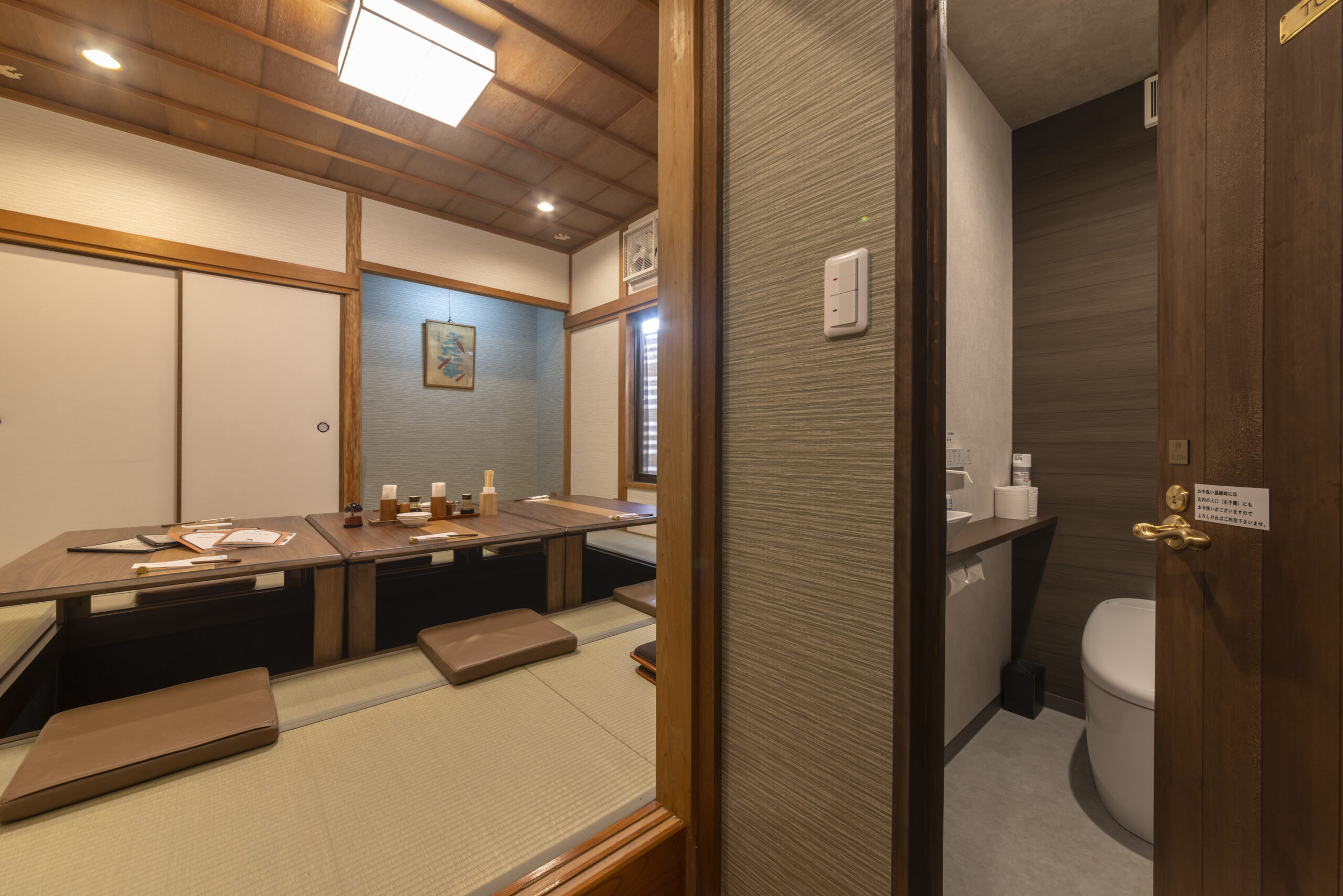 2023年に当店奥のお座敷にお手洗いを併設し、さらに畳のお部屋を座りやすいように掘り炬燵にも変更して完全個室に改装致しご好評頂いております。